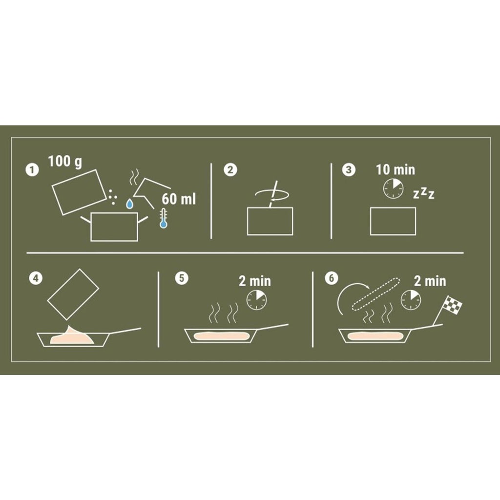 Za pomocą niewielkiej ilości wody i patelni można szybko przygotować złotobrązowy placek. Rezultatem jest świeży, sycący i pożywny chleb, który zapewnia zarówno energię, jak i wygodę, gdy dostęp do konwencjonalnych opcji żywności jest ograniczony. Jego kompaktowe i lekkie opakowanie sprawia, że idealnie nadaje się do plecaków, zestawów ratunkowych i sprzętu outdoorowego.