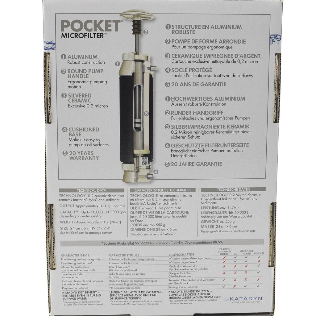 - Mikrofiltr kieszonkowy Katadyn jest idealny dla małych grup, zajmując się potrzebami filtracji wody dla 1-4 osób podczas przedłużonych wędrówek lub wypraw. Jest zaprojektowany tak, aby trwał, z pojemnością do 50 000 litrów, w zależności od jakości wody. Filtr ceramiczny na mocy srebra usuwa szkodliwe bakterie, pierwotniaków i inne środki powodujące choroby. Zapewnienie bezpieczeństwa podczas podróży.