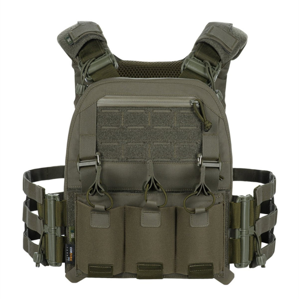 Plate Carrier wykonano z wysokiej jakości Cordury 500D, materiału znanego z wyjątkowej odporności na ścieranie, rozdarcia i duże obciążenia. Wzmocnione szwy i trwałe zapięcia Duraflex zapewniają pewne dopasowanie i długotrwałe działanie nawet w intensywnych warunkach.