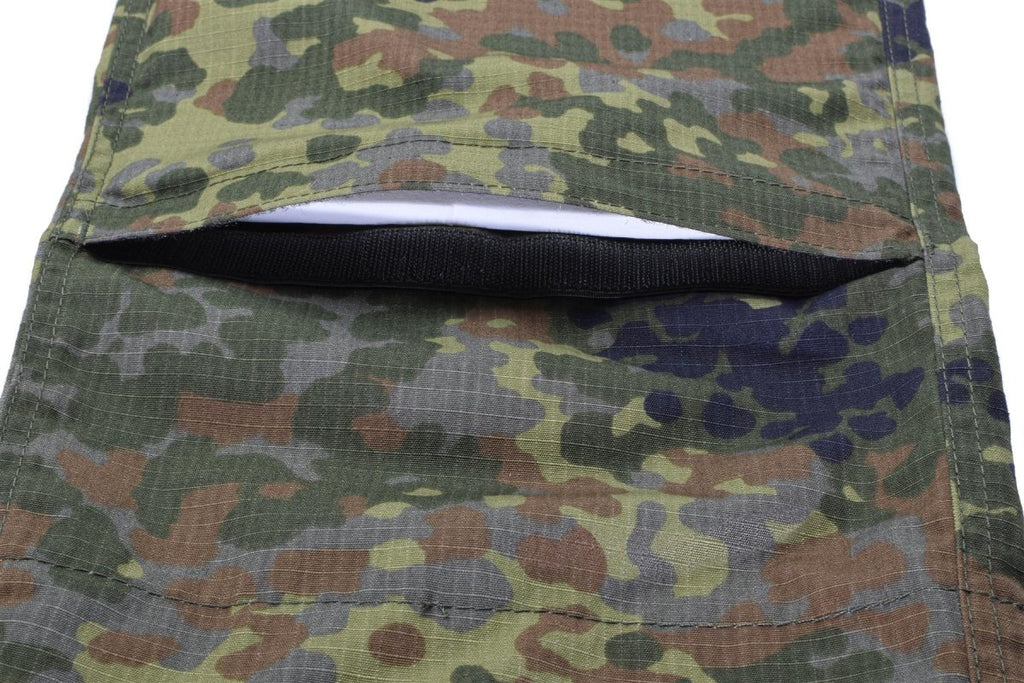 - Te spodnie cargo typu flecktarn, wykonane z wysokiej jakości materiału ripstop, są odporne na rozdarcia i wytrzymują intensywne użytkowanie. Wzmocnione siedzisko i kolana zwiększają trwałość, dzięki czemu idealnie nadają się do raczkowania, klękania lub intensywnej aktywności. Wzór kamuflażu flecktarn płynnie komponuje się z naturalnym otoczeniem, zapewniając skuteczną maskę na obszarach zalesionych.
