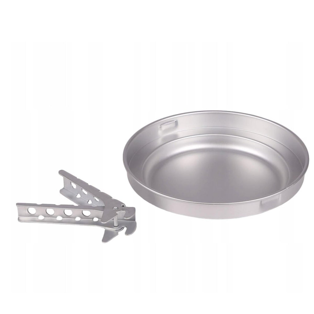 - Ten kompleksowy zestaw składa się z dwóch garnków, patelni i mosiężnego palnika. Oferuje wszystko, co potrzebne do gotowania podczas biwakowania lub pieszych wędrówek. Garnki i patelnie wykonane z lekkiego aluminium są łatwe w przenoszeniu i manewrowaniu.