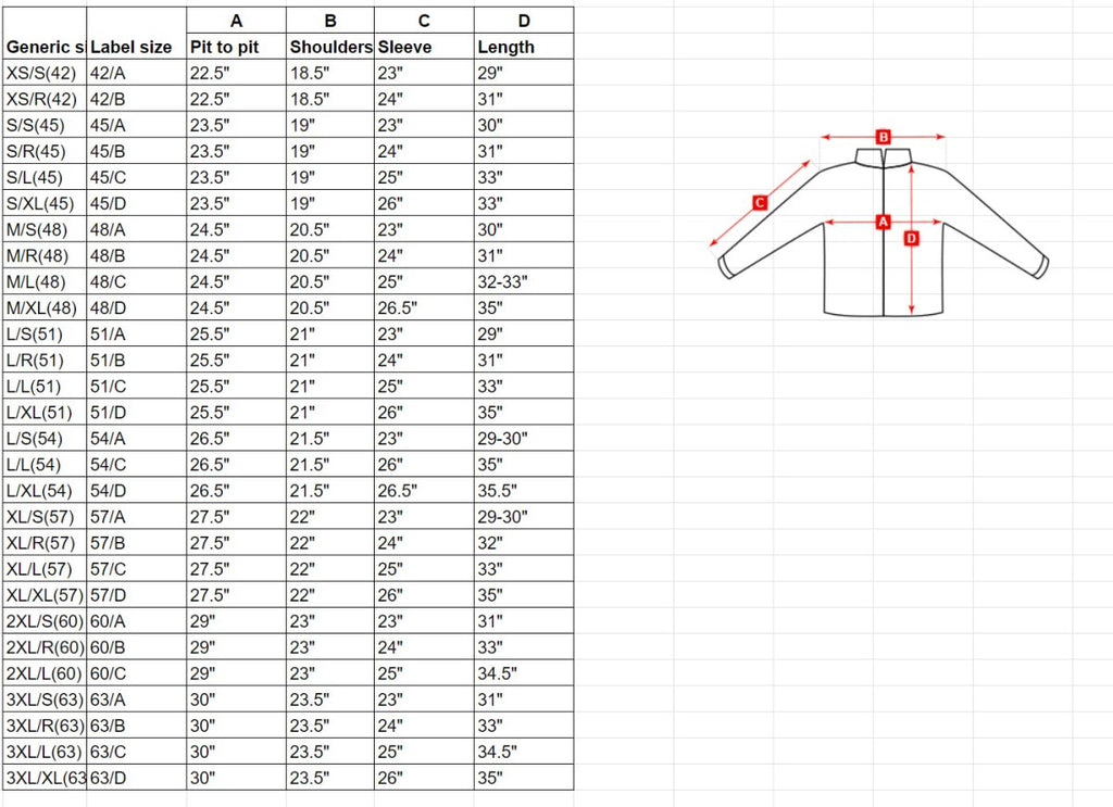 | XS/R(42) | 42/B | 22.5" | 18.5" | 24" | 31" |