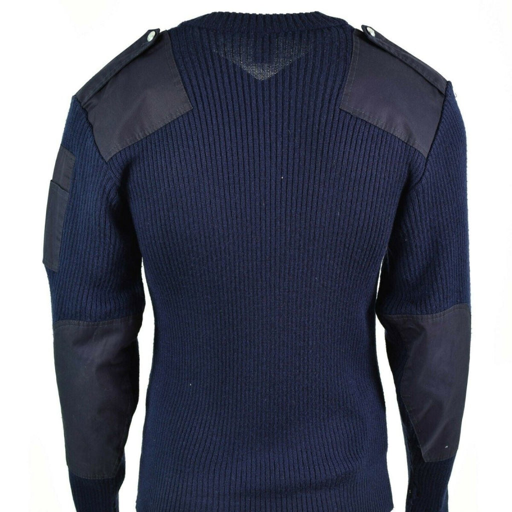 Ciemnoniebieski sweterek z dekoltem w serek łączy w sobie militarny styl z praktycznym designem. Ten włoski egzemplarz z nadwyżki wojskowej zapewnia doskonałą trwałość i wygodę.