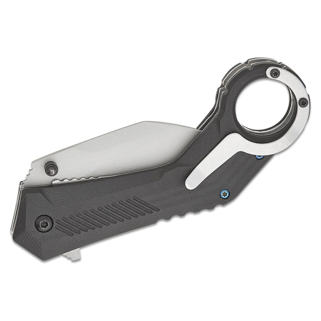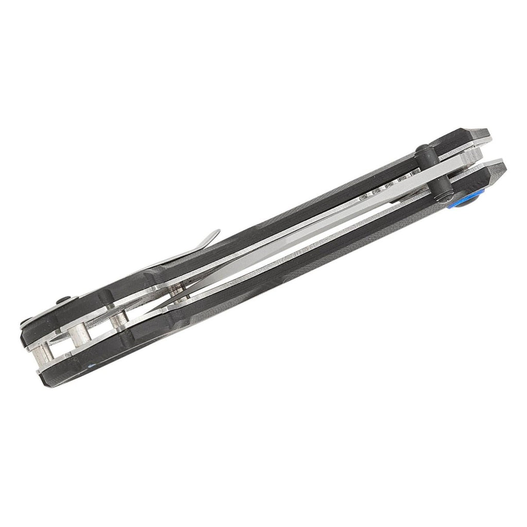 • The Rękojeść G10 sprawia wrażenie solidnego i bezpiecznego w dłoni. Teksturowane detale poprawiają przyczepność nawet w mokrych lub stresujących sytuacjach. Niebieskie linie akcentujące dodają odrobinę nowoczesnego stylu, pokazując, że funkcjonalność i design mogą ze sobą współdziałać. The zamek liniowy utrzymuje ostrze stabilnie podczas użytkowania, a pierścień na palec zapewnia stabilność i szybką obsługę.