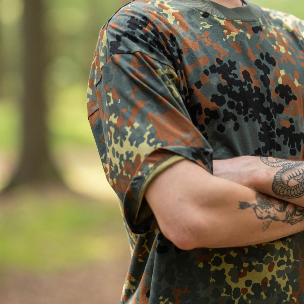 • Wzór flecktarn dobrze komponuje się z naturalnym otoczeniem, dzięki czemu nadaje się na wycieczki na świeżym powietrzu. Niezależnie od tego, czy wędrujesz, biwakujesz, czy po prostu spędzasz dzień na łonie natury, ta koszulka zapewni Ci wygodę i styl. Wojskowa estetyka dodaje surowego akcentu, który uwydatnia Twój sprzęt outdoorowy.