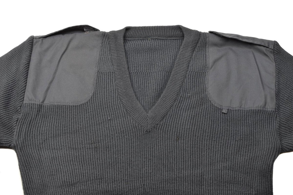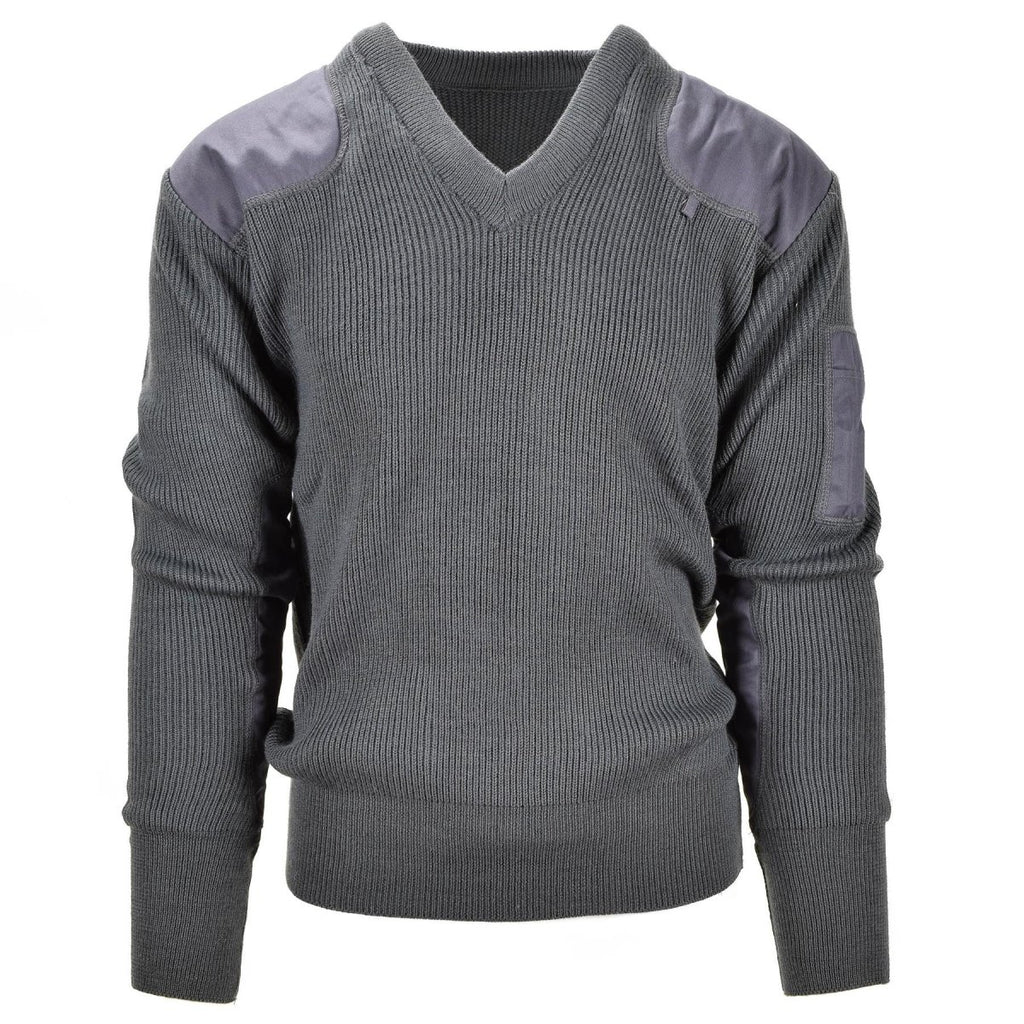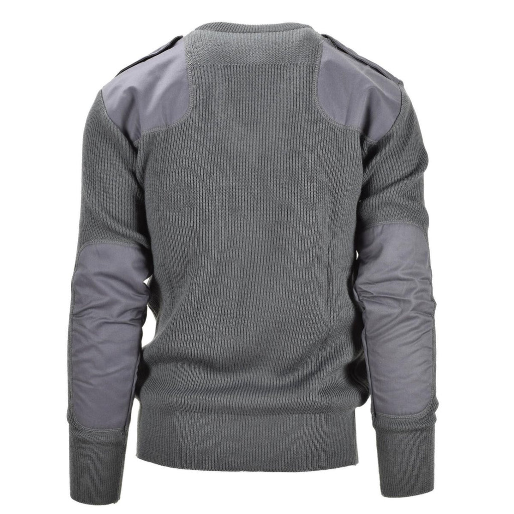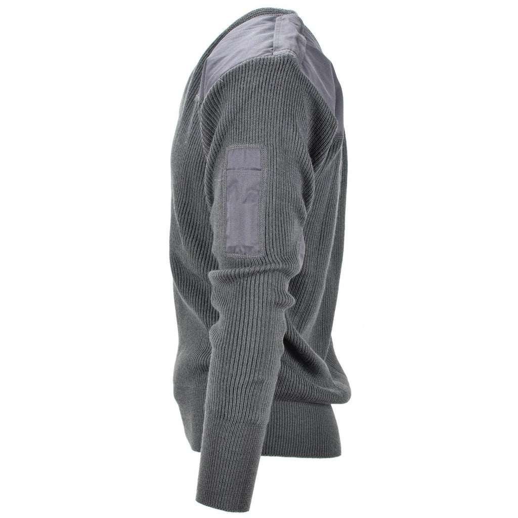 Włoski wojskowy szary wełniany sweter Commando z dekoltem w kształcie litery V i wzmocnionymi łokciami